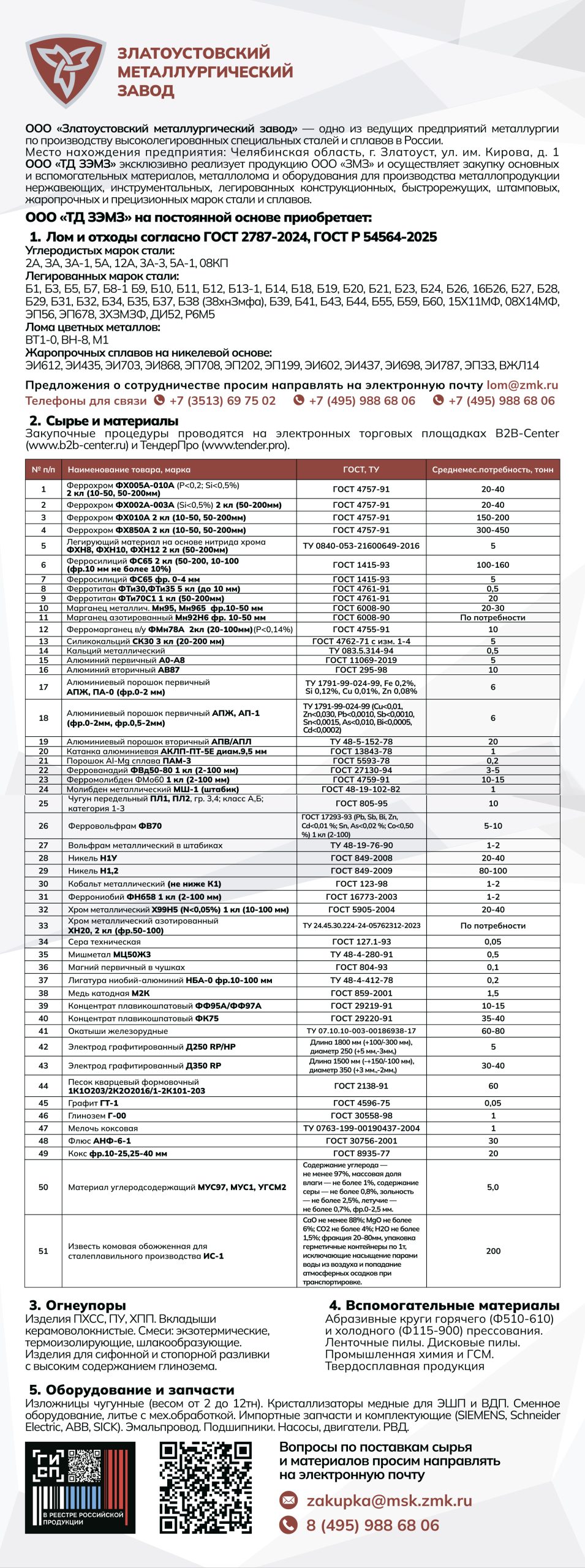 Технико-коммерческие предложения на поставку основных и вспомогательных материалов направлять на адрес: zakupka@msk.zmk.ru